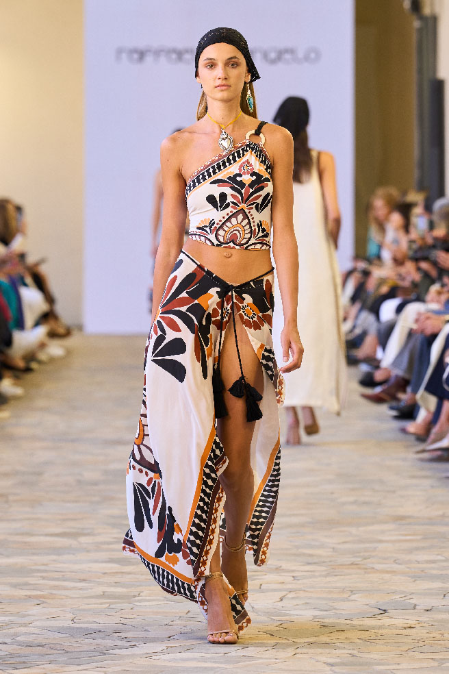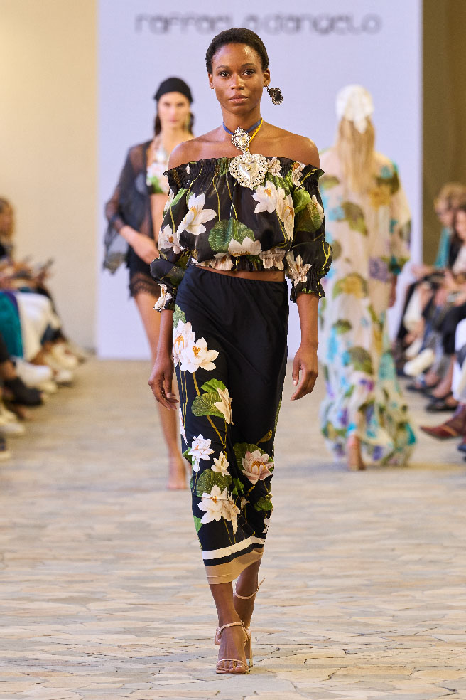 - Ispirazione e Palette: La collezione è descritta come un viaggio tra acqua e luce, con stampe oniriche e ricami preziosi. La palette è vibrante: i neri e le argille d’Africa incontrano il blu d’Egeo, il lilla e l’arancio, con forme acquatiche che richiamano l’arte di Monet ma rivisitate in chiave contemporanea.
