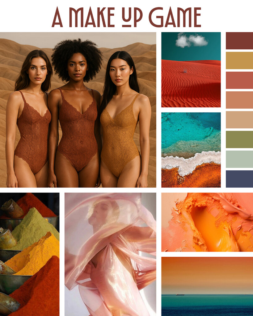 - A Make Up Game (Sensorialità & Materia): Un ritorno alla terra e alla memoria. Toni cosmetici come il terracotta e il rosso pompeiano rivestono tessuti jacquard e jersey performanti, per un intimo che accarezza i sensi in un perfetto equilibrio tra antico e moderno.
