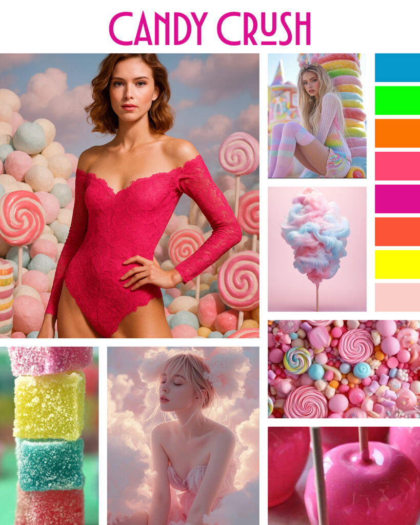 - Candy Crush (Colore & Emozione): Un addio al minimalismo. Spazio a tonalità neon (rosa shocking, verde acido, rosso vibrante) su tulle e pizzi per una narrazione giovane e fiabesca, pensata per comunicare gioia e stati d’animo.