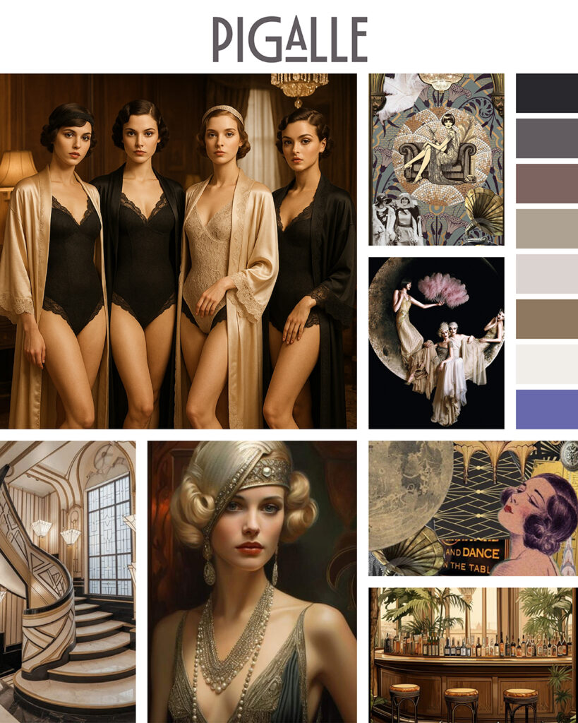 - Pigalle (Seduzione Retrò): Un omaggio alla Parigi degli anni ’20. Bustier e grafiche ispirate all’Art Nouveau celebrano una femminilità colta e sofisticata, trasformando la donna in una musa tra trasparenze studiate e richiami esotici.